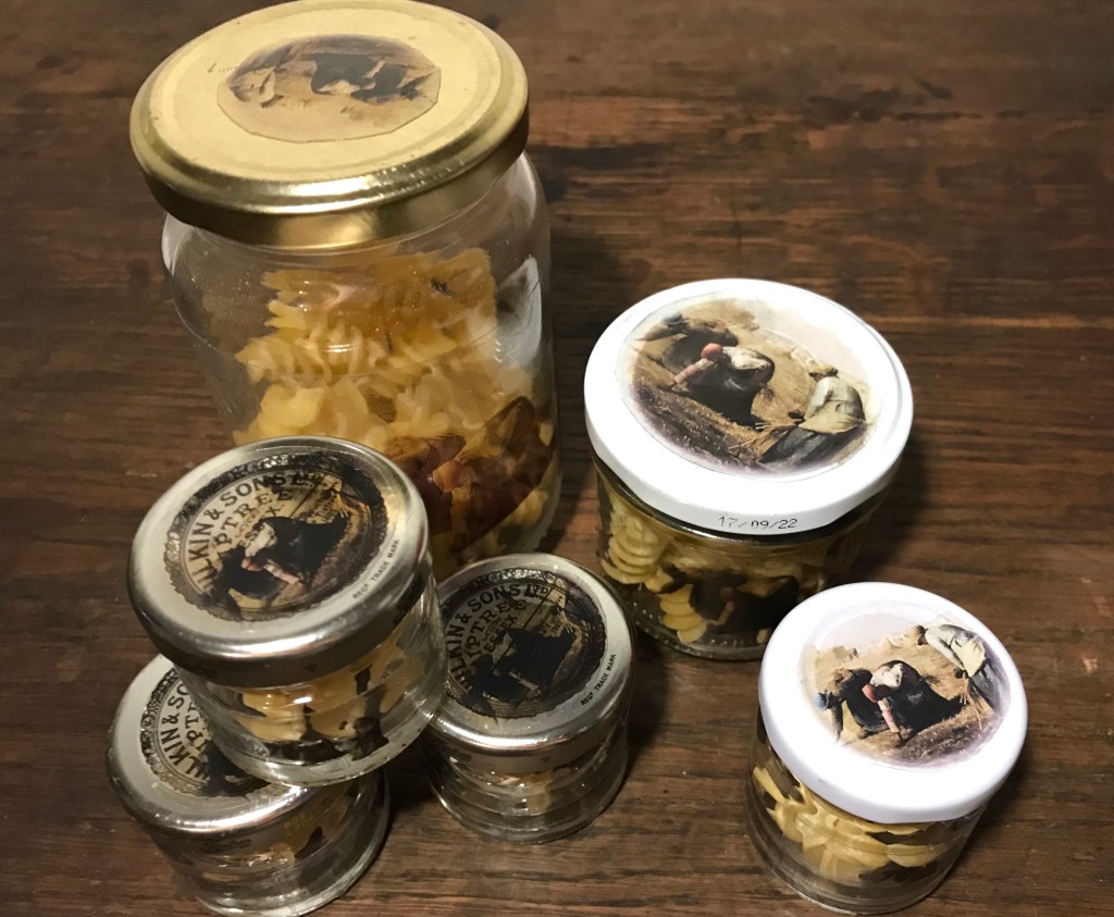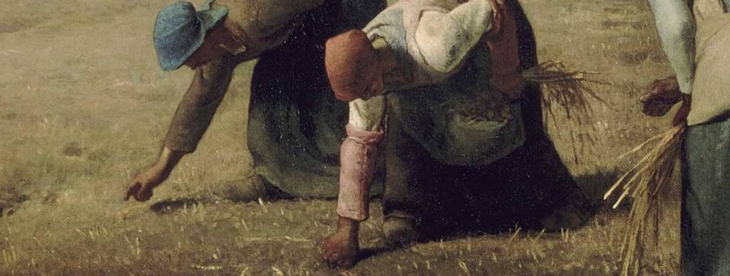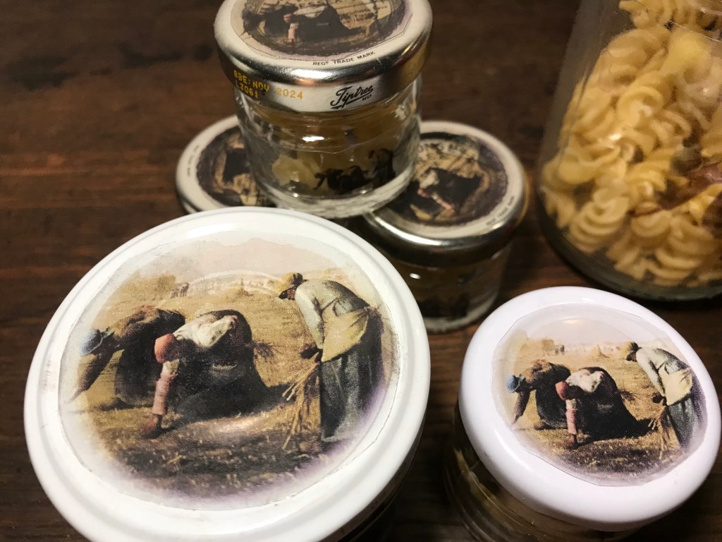 Des pots en verre customisés à l’effigie des Glaneuses. On y voit trois femmes qui ramassent des épis de blé tombés au sol après le fauchage des paysans, au fond. C’était une pratique sociale répandue, où les femmes paysannes les plus pauvres étaient « autorisées » à venir récolter les restes, glaner les miettes. Loin d’un idéal bucolique, il s’agit d’une représentation de la misère et de l’extrême pauvreté. La composition et le coloris nous rendent l’image acceptable. Il n’y a pas particulièrement de commentaire, si ce n’est de nous dire que cela existe. Rendre le réel visible est une fonction importante de l’art, surtout lorsqu’il s’agit de mettre à jour des dominations. Mais comment utiliser cette image aujourd’hui alors qu’elle renvoie à une pratique du « glanage » agricole qui ne fait plus partie de notre quotidien ? Ce serait quoi les glaneuses aujourd’hui ? Peut être des mères de famille qui font la fin de marché pour ramasser les fruits et légumes, mais version gluten et super U, qui compteraient les pâtes avant de les mettre dans la casserole.