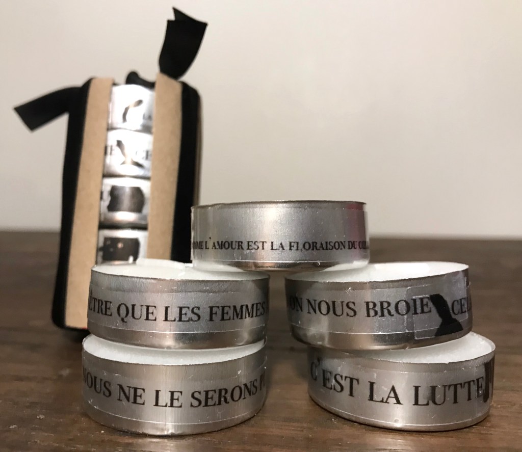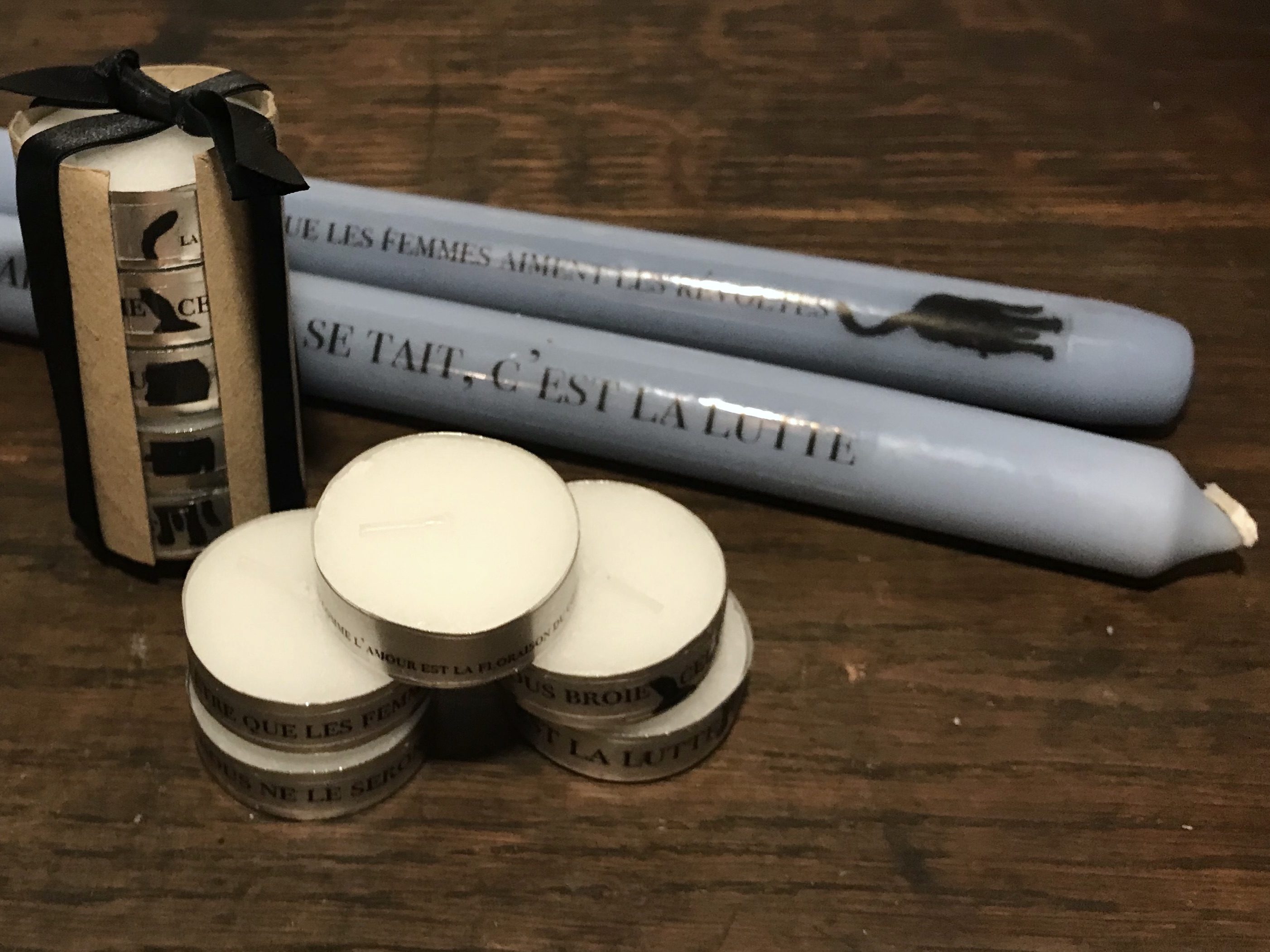 Des cierges de dévotions Chauffe plat et des cierges Chandelles, tels qu’on les trouve dans les lieux de pèlerinage chrétiens, sur lesquels figurent des citations de Louise Michel accompagnées du chat noir de l’Olympia, qui deviendra dans ces mêmes années, un symbole de l’Anarchisme. J’ai toujours été fascinée par la synchronicité des évènements. Par exemple : en 1863, tandis qu’à Lourdes des centaines de croyants se ruent autour d’une bergère de 19 ans qui frôle le burn out depuis qu’elle a vu la Vierge apparaitre dans une grotte 5 ans plus tôt, à Paris, Manet fait scandale avec les deux femmes de son Olympia et Louise Michel, une institutrice de 33 ans, découvre l’anarchisme politique. Comment autant de choses ont pu se passer en même temps ? Peut-on les raconter simultanément ?