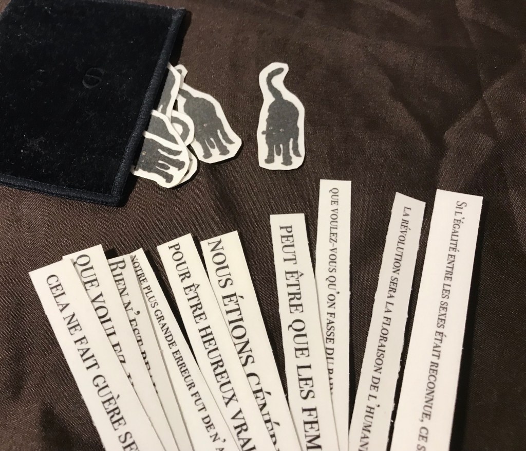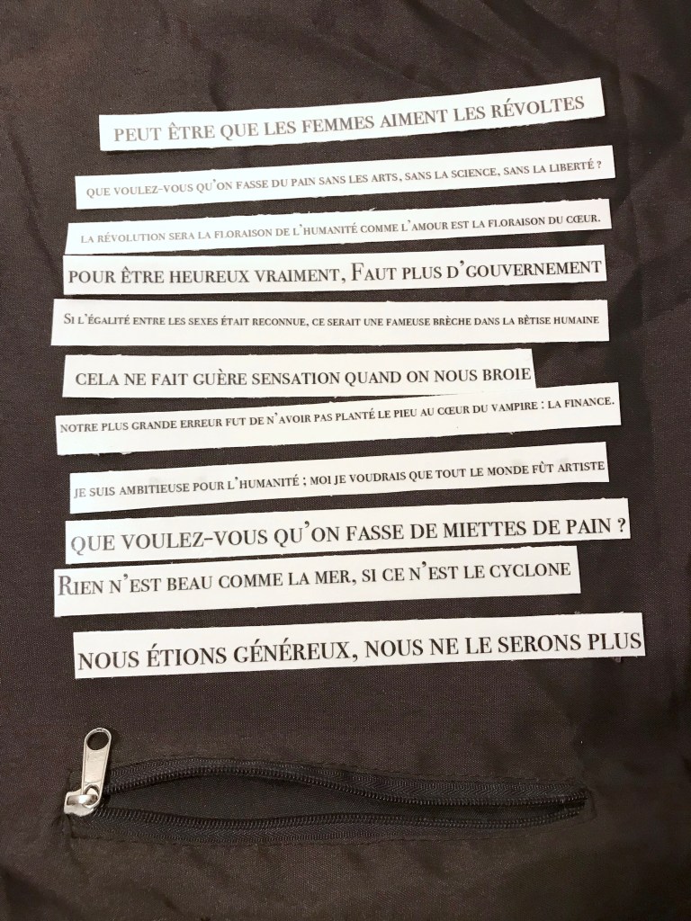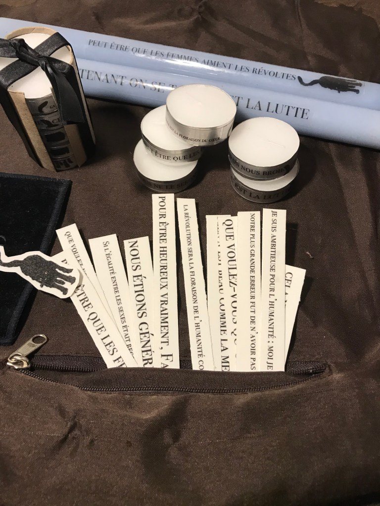 Une série de stickers composés de citations de Louise Michel en bâtonnets et de petits chats noirs de l’Olympia. Ils sont à coller contre une vitre, du côté de la face imprimée, à destination des passants. Comme les vignettes sur les pare brises ou les messages d’accueil dans une vitrine, il s’agit de s’adresser à l’autre, de lui envoyer un message.