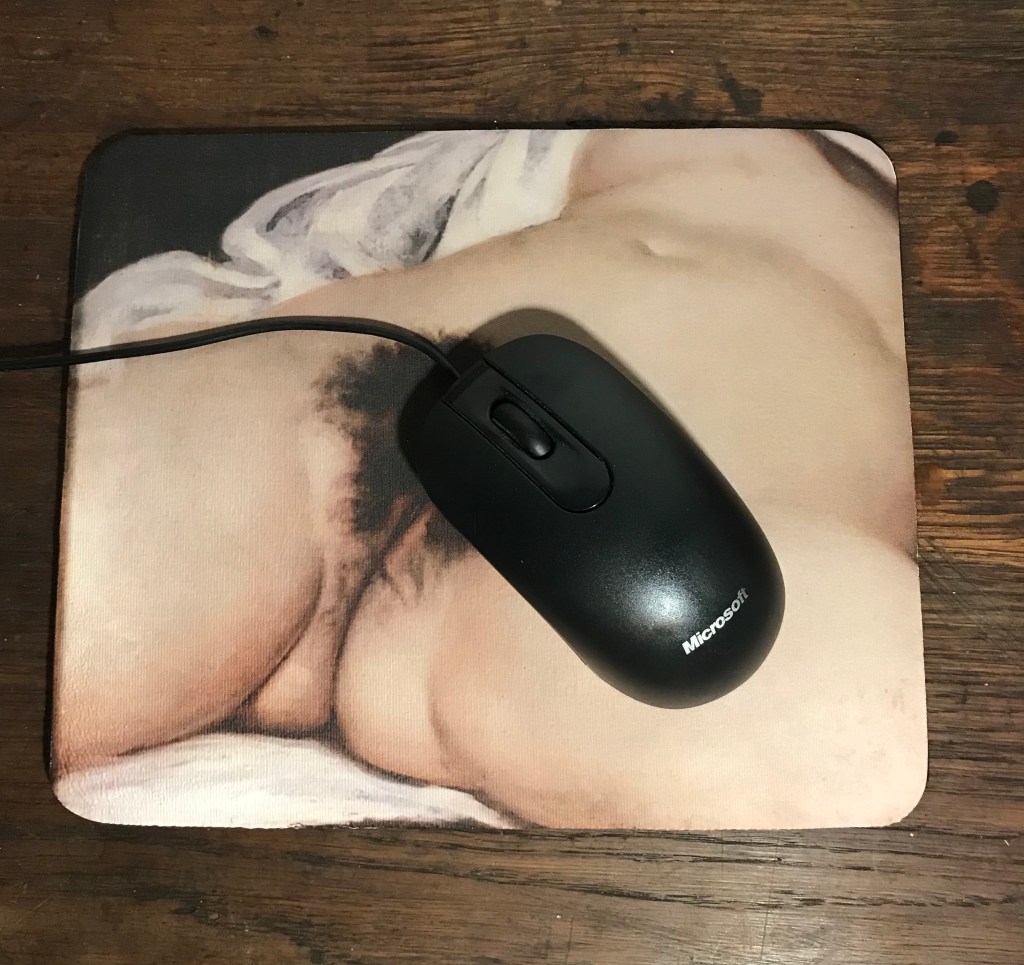 Un Tapis de souris Origine du Monde. Pour scroller, cliquer et double cliquer au jeu de la chatte et de la souris. Un objet un brin désuet qu’on peut utiliser comme dessous de plat si on a plus de souris.