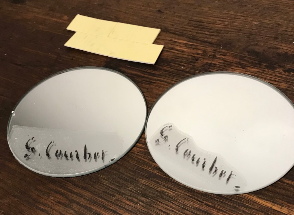 Mon beau miroir. En prolongement ou comme une suggestion de présentation du tatoo : un petit miroir signé « G.Courbet » pour se regarder la chatte comme on regarde une œuvre d’art. Côté pratique, ce petit objet se tient dans la main et peut réellement aider lors d’une auto épilation, une auto-inspection médicale ou une masturbation avec stimulation scopique. Il est vendu avec ses petites accroches à coller pour une fixation murale.